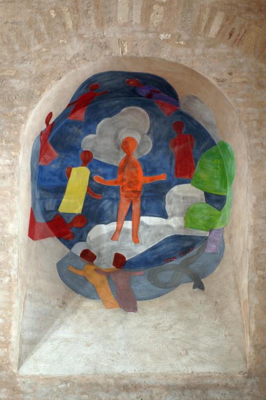 "Das Bild des Omega hat ein vom Alpha verschiedenes Gestaltungsmotiv. Es hat mehr die Vielfalt der Bewegung und die Formen der sichtbaren Welt (Wolken, Baum, Menschen, Tier). Dominierend, aber doch mit einer Haltung des Sichhineingebens, alles vereinend, die Mitte der Mensch gewordenen Liebe, Christus. Um ihn ist alles in einer starken gemeinsamen Bewegung, die Menschen mitsamt allem Geschaffenen. Es ist die reine Freude am Sein. Ein Dasein, in dem die Bedinungen der Materie zwar nicht aufgehoben, aber in die Freiheit des Geistes einbezogen sind. Die Farben der Menschen und der Gegenstände vereinigen sich in einer Harmonie, die in Christus ihre strahlende Fülle erreicht." So beschreibt Ferdinand Gehr selbst das Omega, die Endzeit.